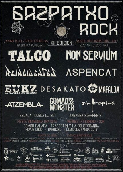 El próximo Sábado 18 de Febrero en Ayora (Valencia) se celebrará la duodécima edición del festival Gazpatxo Rock. Con un cartel de lujo compuesto por 10 grupos: Talco, Non Servium, Reincidentes, Aspencat, El Ultimo Ke Zierre, Desakato, Mafalda, Gomad! & Monster, Atzembla y Sin Propina.