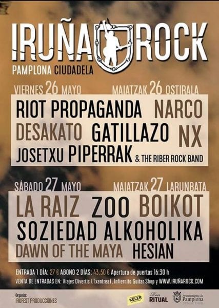Por otra parte ya se conoce que bandas actuarán cada jornada en la primera edición del Iruña Rock, festival que en las últimas horas ha anunciado que se trasladará a la Ciudadela de Pamplona (Navarra). De este modo el viernes 26 de mayo Nx, Josetxu Piperrak & The Riber Rock Band, Los Gatillazo, Desakato, Narco y Riot Propaganda pasarán por el escenario y el sábado 27 de mayo serán Soziedad Alkoholika, La Raíz, Boikot, Zoo, Hesian y Dawn of the Maya quienes se suban a las tablas.
