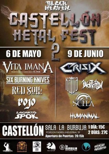 Como cabezas del cartel los indiscutibles Vita Imana que además estarán presentado su nuevo disco, Crisix los cuales ya arrasaron en la edición anterior. Six Burning Knives, grupo referente en todo el Levante y que además este año estará acompañando como teloneros a Vita Imana en tres fechas consecutivas (Castellon, Valencia y Alicante) y tocando una fecha más con ellos en otro gran festival como es el Aquelarre Rock Metal Fest, a parte de todos los festivales en los que han sido confirmados (Euskal Metal Fest, Old Skull Fest, Mad Viking Fest…), Scila grupo de Alicante que vuelven con más fuerza que nunca. Katoa, anteriormente conocidos como Crow es un grupo referente en Castellón y que además harán ese día la presentación oficial de su nuevo disco.Rojo grupo de Valencia, Inception de Castellon, Humanimal de Castellón, Lagarto Spok con miembros del antiguo grupo Abortos de Satán y los noveles Red Soil un grupo que está dando mucho de qué hablar.