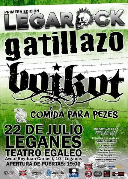Extreme Music y el grupo Twister Rock&Food organizan el primer concierto LegaRock el proximo 22 de Julio con Boikot y Gatillazo como principales apuestas para esta primera edición. Los conciertos se desarollarán en el anfiteatro Egaleo de Leganés. Cinco horas de conciertos enmarcados durante las lunas de Egaleo. Junto a ellos estarán la banda local Comida para Pezes, que abrirán la jornada a partir de las 19:00h.