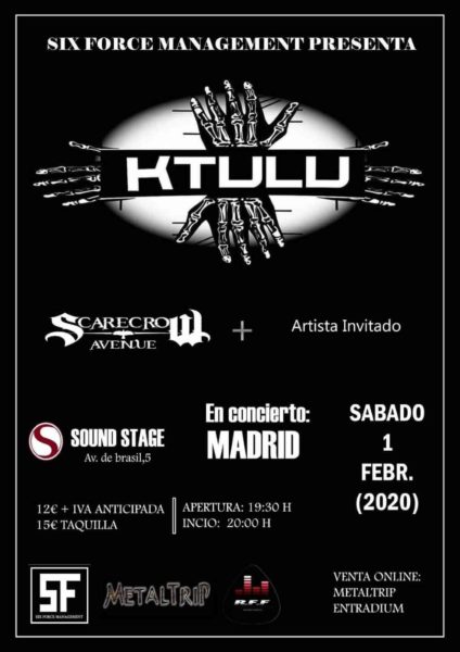 La banda de Metal KTULU actuará en Madrid después de 6 y medio sin actuar en la capital, el próximo 1 de Febrero de 2020 en la Sala Sound. Estarán presentando su nuevo trabajo «El alma de las bestias» junto a ellos les acompañarán los murcianos SCA Scarecrow Avenue y un grupo artista invitado que está por desvelar.