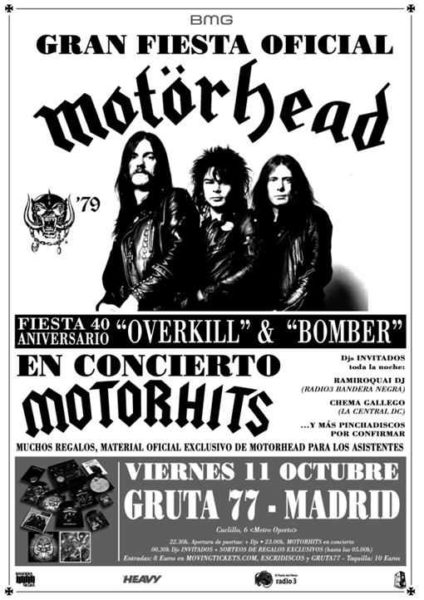 La ineludible cita será el Viernes 11 de Octubre, en la Sala Gruta77 – Madrid <Metro Oporto>. Comenzará (a las 22.30h.) con Djs invitados donde ya han confirmado su asistencia RAMIROQUAI DJ (BANDERA NEGRA en Radio 3 Extra), CHEMA GALLEGO (La Central DC), MIGUEL ANGEL BARQUERO (PLANETA TENTACIONES en R.Tentación) y otros Djs que se irán sumando durante toda la noche y hasta las 5 de la madrugada. Además contaremos con la actuación en directo de MOTÖRHITS (23.00h.), para muchos seguidores, la mejor banda homenaje a la banda de LEMMY KILMISTER.