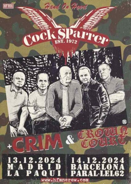 Después de ser los cabezas de cartel del MONDRA & ROLL y demostrar-nos una vez mas que son la mejor banda de street punk rock del planeta COCK SPARRER vienen para presentarnos su nuevo disco “Hand On Heart” en las ciudades de MADRID y BARCELONA. Serán dos conciertos muy especiales en sala pequeña donde sabemos que se desarrollan mejor y podréis disfrutarlos como nunca. Prometen tocar canciones del nuevo disco, algún tema que no han tocado últimamente y alguna sorpresa mas.