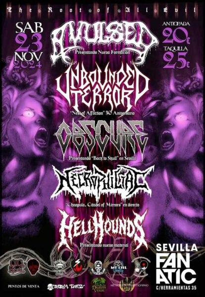 La promotora Oliskull se enorgullece en anunciar The Root Of All Evil, un festival que se perfila como uno de los más importantes del Old School Death Metal en España. Este evento único reunirá a cuatro de las bandas pioneras del género en una noche que promete ser inolvidable para los amantes del metal extremo. El festival se celebrará, el sábado 23 de noviembre de 2024, en la emblemática Sala Fanatic de Sevilla.
