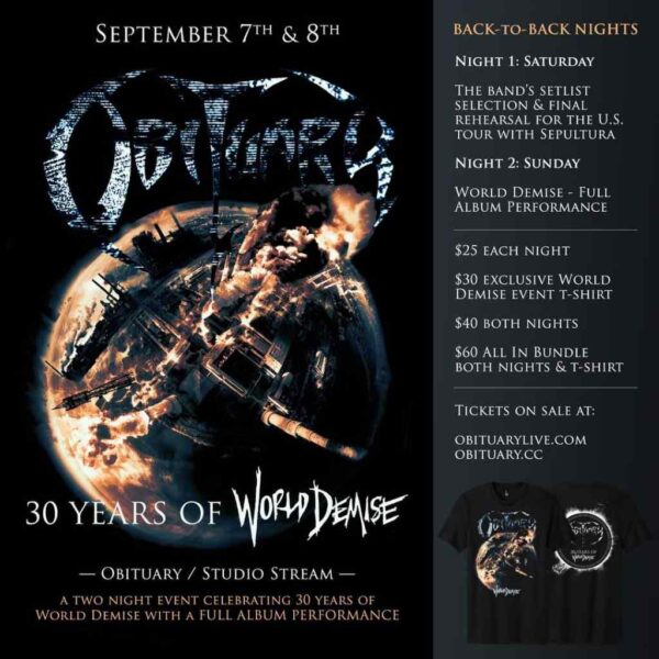 «Estamos muy emocionados y queremos invitar a todos nuestros fans de todo el mundo a unirse a nosotros el 7 y 8 de septiembre (5 p. m. EST) para celebrar el 30.° aniversario de World Demise con una transmisión en vivo desde RedNeck Studio, en Florida, y brindarles dos noches consecutivas de clásicos de OBITUARY y la presentación completa del álbum ‘World Demise’».