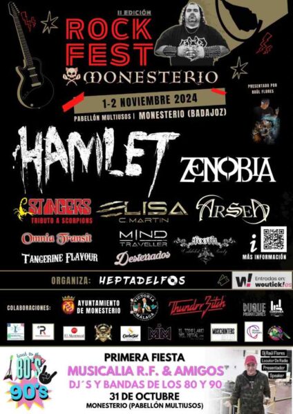 Los próximos 1 y 2 de Noviembre, en la localidad pacense de Monesterio, se celebrará una nueva edición del Monesterio Rock Fest, el cual contará con un cartel de auténtico lujo con la presencia de HAMLET, STINGERS, ELISA C. MARTIN, DESTERRADOS, ARSEA, ZENOBIA, OMNIA TRANSIT., MIND TRAVELLER, TANGERINE FLAVOUR y TOOTH UNLABELED SOCIETY.