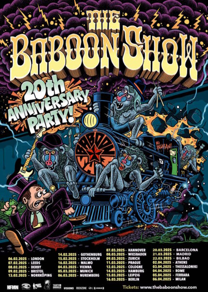 Por ello, THE BABOON SHOW arrancarán en 2025 año de este aniversario, una gira europea como jamás han tenido anteriormente. Visitando nueve países en un total de veintisiete conciertos: Reino Unido, Suecia, Austira, Alemania, Suiza, República Checa, España, Grecia e Italia.