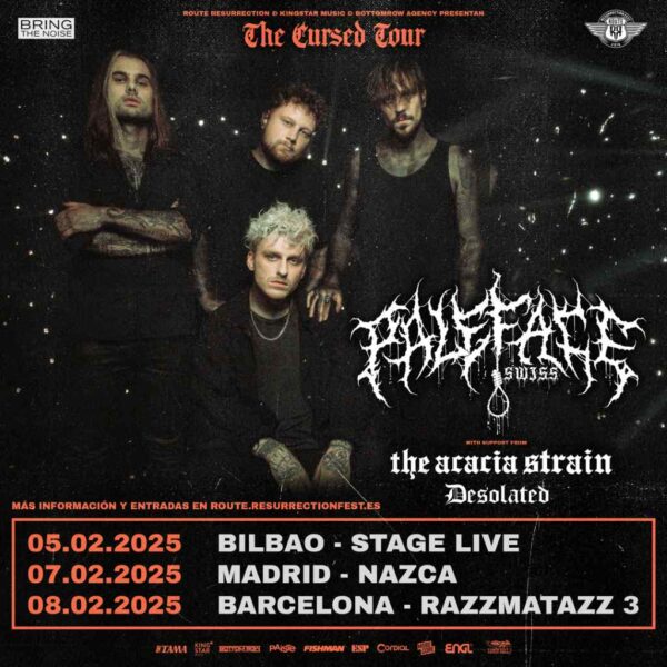 Los suizos PALEFACE SWISS, en activo desde 2017 y con dos discos y dos EPs lanzados hasta la fecha, comenzarán 2025 con su Europe Headline Tour haciendo tres fechas en nuestro país en febrero acompañados de The Acacia Strain y Desolated.