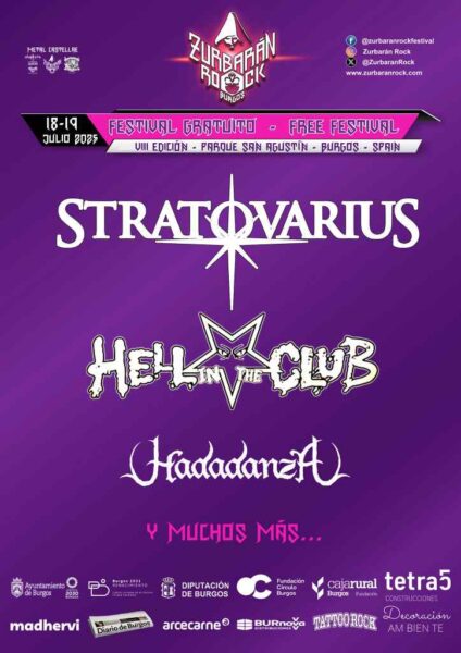 El festival gratuito Zurbarán Rock Burgos 2025, que se llevará a cabo los días 18 y 19 de julio en el Parque de San Agustín, ha desvelado los nombres de los primeros grupos que actuarán en el evento. Uno de los cabezas de cartel será la banda finlandesa de Power Metal STRATOVARIUS. Junto a ella otras dos formaciones confirmadas: los italianos HELL IN THE CLUB (Hard Rock) y los alicantinos HADADANZA (Folk Metal).