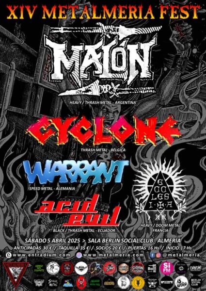 «Presentamos el cartel oficial del próximo Metalmeria Fest. Cómo sabéis se celebrará el sábado 5 de abril de 2025 a partir de las 17:00 horas en el Berlín Social Club – Almería.