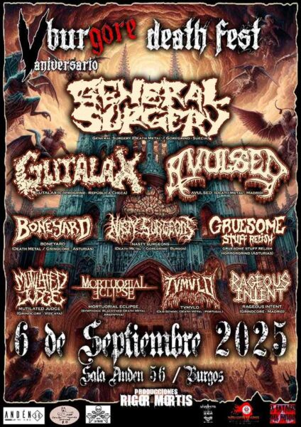 Anunciamos cartel completo de lo que será nuestro V aniversario que tendrá lugar el próximo 6 de septiembre de 2025 en Sala Andén 56 . En esta ocasión, encabezando el festival tendremos a la leyenda sueca del Death / Goregrind GENERAL SURGERY, con más de 30 años de recorrido en la escena