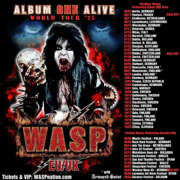 La emblemática banda de heavy metal W.A.S.P. celebra el 40º aniversario de su álbum debut con la gira mundial «One Alive 2025». Por primera vez en cuatro décadas, interpretarán el álbum completo en una serie de conciertos especiales en Europa y el Reino Unido.