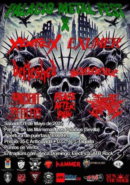 La décima edición del Palacio Metal Fest se llevará a cabo el sábado 31 de mayo de 2025 en el Parque de Las Marismas, ubicado en Los Palacios y Villafranca, Sevilla. Este festival se ha consolidado como un referente en la escena metalera andaluza y española.