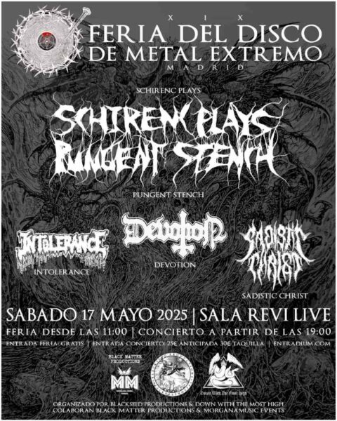 La XIX Feria del Disco de Metal Extremo de Madrid se celebrará el sábado 17 de mayo de 2025 en la Sala Revi Live, ubicada en la calle de los Cavilas 4, en el barrio de Vicálvaro. Este evento, organizado por BlackSeed Productions y Down With The Most High, en colaboración con Black Matter y Morgana Music Events, se ha consolidado como una cita imprescindible para los amantes del death metal y sus vertientes más extremas.