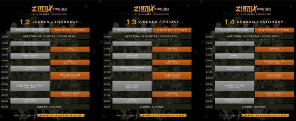El Z! Live Rock Fest celebra su décimo aniversario del 12 al 14 de junio de 2025 en el Recinto Ferial IFEZA de Zamora, consolidándose como uno de los festivales de metal más destacados de España. Con un cartel encabezado por Dream Theater, Sepultura y Accept, la organización ha publicado los horarios oficiales y la distribución por días de las actuaciones.