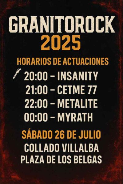 El Granito Rock Festival celebra su 25ª edición el 26 de julio de 2025 en la Plaza de los Belgas de Collado Villalba (Madrid), ofreciendo entrada completamente gratuita. Este año trae un cartel internacional liderado por las bandas Myrath y Metalite, dos propuestas de primer nivel en el panorama metálico contemporáneo.