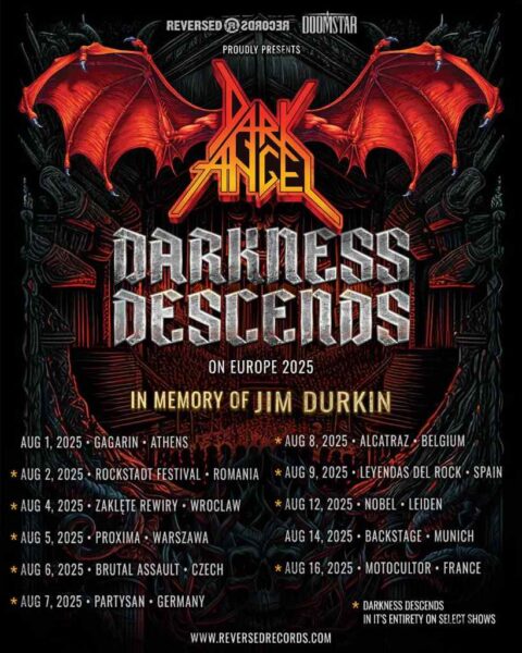 La legendaria banda estadounidense de thrash metal, Dark Angel, llevará a cabo una gira europea en el verano de 2025 titulada Darkness Descends on Europe, en homenaje póstumo a su guitarrista fundador Jim Durkin, fallecido en 2023. Durante esta gira, interpretarán íntegramente en directo su emblemático álbum “Darkness Descends” (1986), ampliamente reconocido como un referente del thrash técnico y extremo.