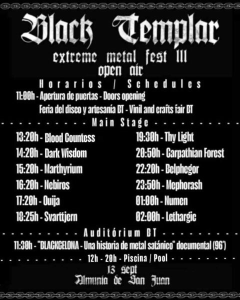 Este sábado 13 de septiembre de 2025 se celebra la tercera edición del Black Templar Extreme Metal Fest en la Almunia de San Juan (Monzón, Huesca). Por primera vez, el festival pasa al formato open air, ampliando su experiencia con actividades paralelas y un cartel emblemático del metal extremo.