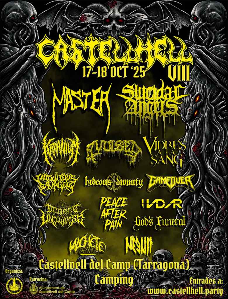 La octava edición del CastellHell se celebrará los próximos 17 y 18 de octubre de 2025 en Castellvell del Camp (Tarragona), ofreciendo dos días de metal extremo en una experiencia 100% underground. El cartel definitivo incluye nombres históricos y de culto como Master, Suicidal Angels, Avulsed, Vidres a la Sang, Hideous Divinity y Kraanium, junto a una potente representación del underground con bandas como Devorate The Universe, Neguit, Machete Law, Peace After Pain, Indar y God’s Funeral, entre otras.