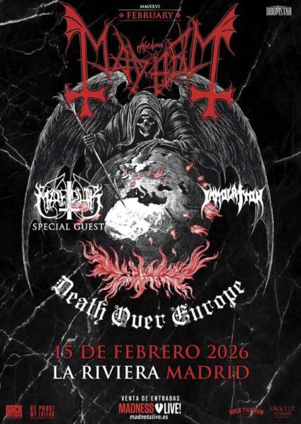 El próximo 15 de febrero de 2026, la sala La Riviera de Madrid será el escenario de una noche histórica para los amantes del metal extremo. Las legendarias bandas Mayhem, Marduk e Immolation se unirán en un único concierto en España, formando parte de la gira «Death Over Europe», presentada por Madness Live!. Esta velada promete ser una de las más intensas y oscuras del año, reuniendo a tres pilares fundamentales del black y death metal mundial.