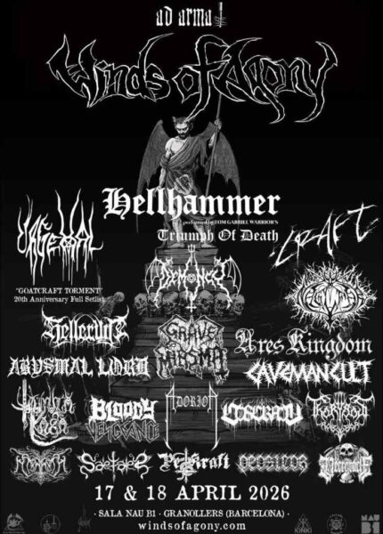 El festival Winds Of Agony regresará en 2026 a Granollers (Barcelona), retomando su espíritu de metal extremo con un cartel renovado que incluye a Hellhammer performed by Triumph Of Death. La cita se celebrará los días 17 y 18 de abril de 2026 en la sala Nau B1.