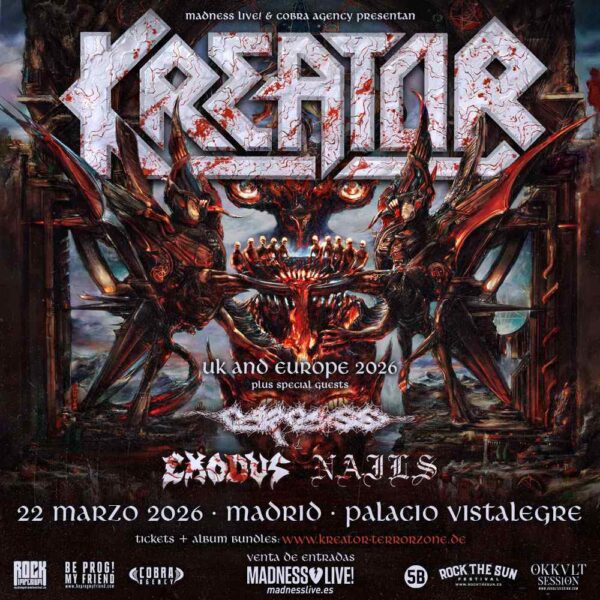 La banda alemana Kreator encabezará un concierto histórico en Madrid el 22 de marzo de 2026, acompañada por tres fuerzas del metal extremo: Carcass, Exodus y Nails. Esta noche promete ser una de las más intensas del próximo año para los aficionados al thrash, death, hardcore y grind.