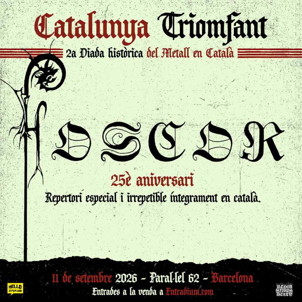 La esperada segunda edición del festival Catalunya Triomfant ha sido confirmada para el 11 de septiembre de 2026, en la sala Paral·lel 62 de Barcelona. En esta ocasión, los organizadores han anunciado a la veterana banda Foscor como cabezas de cartel, en un evento que reivindica el metal extremo en lengua catalana y que vuelve tras el éxito histórico de su primera entrega.