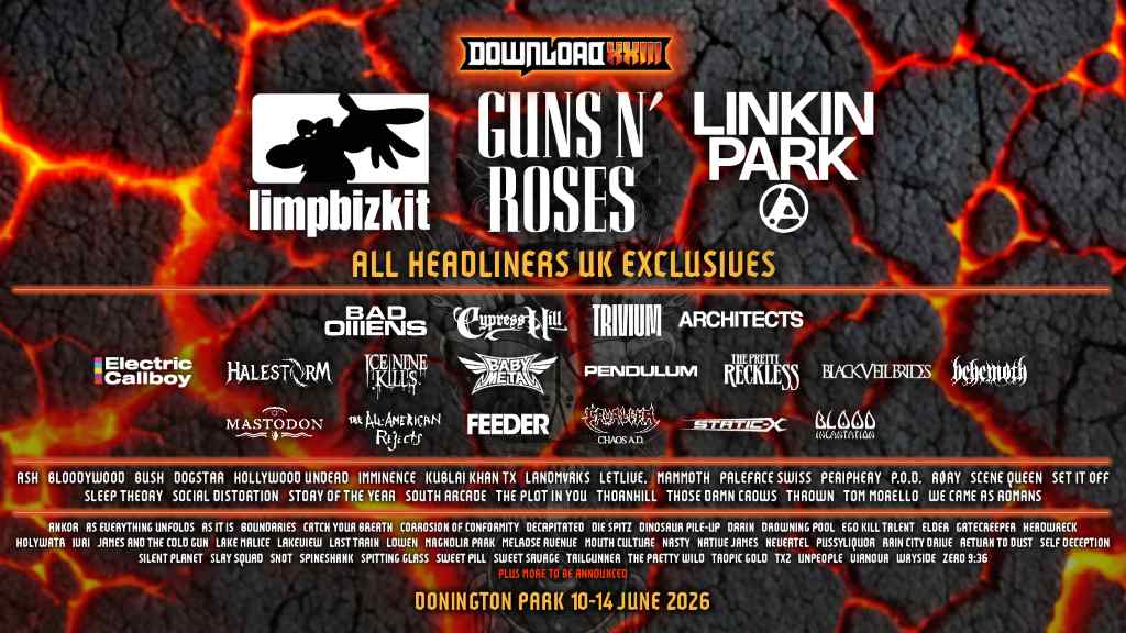 El prestigioso festival Download Festival se prepara para su edición de 2026, que tendrá lugar del 10 al 14 de junio de 2026 en el recinto de Donington Park, Reino Unido. Como cabezas de cartel se han confirmado tres bandas de enorme impacto global: Guns N’ Roses, Limp Bizkit y Linkin Park.