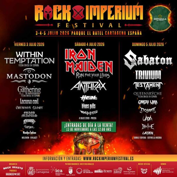 La edición del Rock Imperium Festival 2026, que se celebrará del 3 al 5 de julio de 2026 en el Parque de la Cuesta del Batel (Cartagena), ha cerrado oficialmente su cartel. Entre los nombres más destacados figuran Anthrax, Testament, Within Temptation, Iron Maiden, Mastodon, además de otras formaciones internacionales y nacionales de gran peso en la escena del rock y el metal.