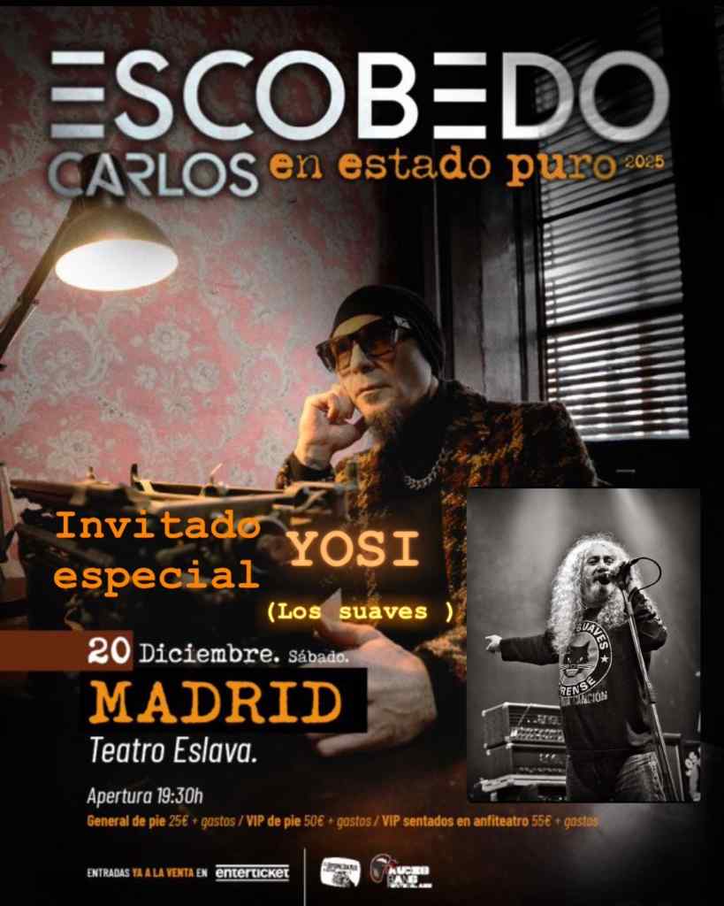 El músico madrileño Carlos Escobedo (líder de Sôber) ha anunciado que ofrecerá un concierto especial el próximo 20 de diciembre de 2025 en el Teatro Eslava de Madrid para presentar su nuevo trabajo en solitario, “Solitud”. En dicha cita contará como invitado de honor con Yosi (de Los Suaves).