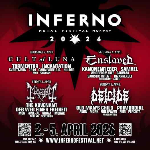 El veterano evento de metal extremo Inferno Metal Festival ha revelado oficialmente su cartel completo para 2026. El festival se celebrará del 2 al 5 de abril de 2026 en Oslo (Noruega), distribuyéndose en los recintos Rockefeller Music Hall y John Dee Live Club & Pub.