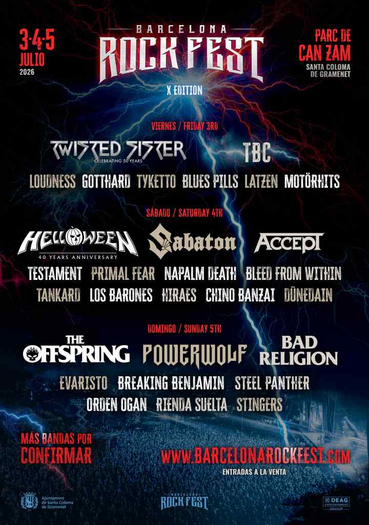 El festival Barcelona Rock Fest 2026 acaba de anunciar una nueva oleada de confirmaciones que eleva su cartel a 28 bandas. Entre las incorporaciones destacan Sabaton, The Offspring, Testament y Bad Religion. El evento tendrá lugar los días 3, 4 y 5 de julio de 2026 en el Parc de Can Zam de Santa Coloma de Gramenet (Barcelona).