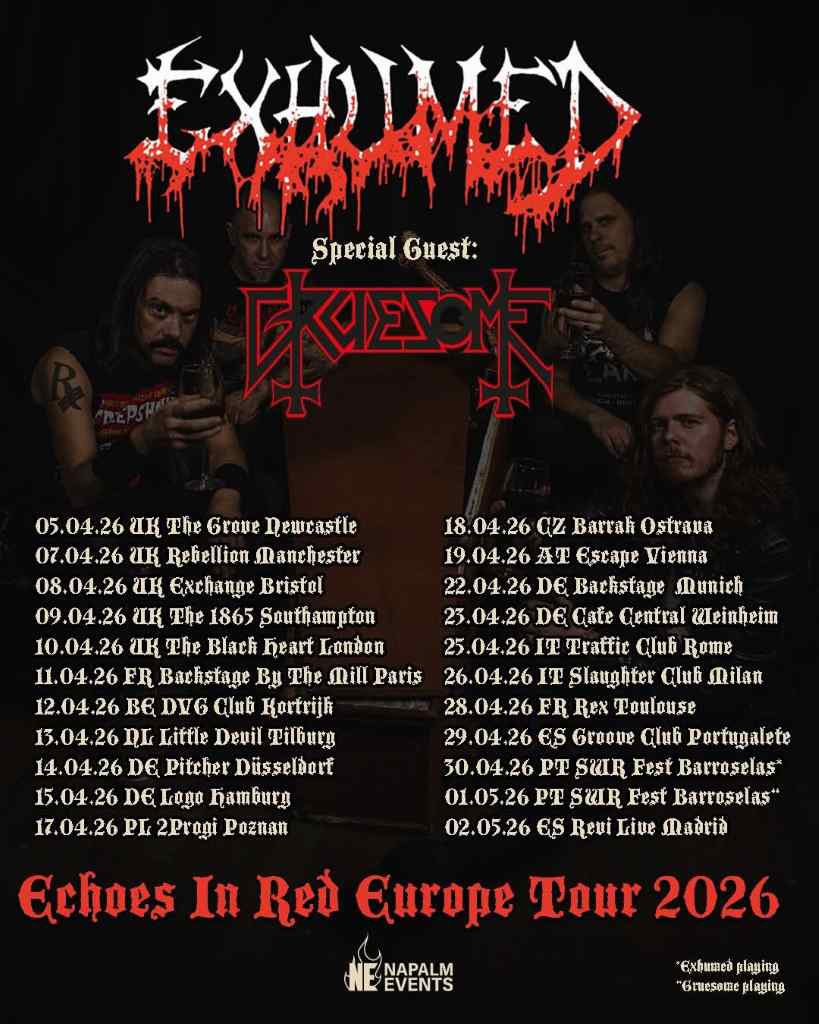 Las formaciones estadounidenses Exhumed y Gruesome han confirmado dos conciertos en España dentro de su gira 2026, una cita obligada para seguidores del death metal más brutal.