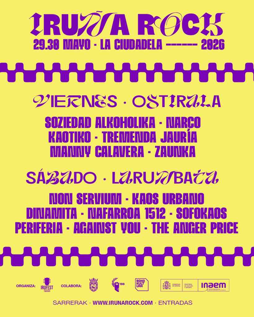 El festival Iruña Rock 2026 ha publicado la distribución por días de su cartel para la próxima edición, que tendrá lugar los días 29 y 30 de mayo de 2026 en La Ciudadela de Pamplona. Entre los nombres confirmados destacan varias formaciones destacadas del rock y punk estatal, prometiendo dos jornadas llenas de energía.