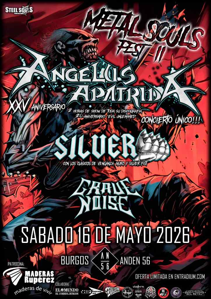 La banda española de thrash metal Angelus Apatrida liderará la segunda edición del Metal Souls Fest, que se celebrará el sábado 16 de mayo de 2026 en la Sala Andén 56 de Burgos. Este será un concierto único de dos horas donde la banda interpretará todos sus clásicos, conmemorando su XXV Aniversario y el XX Aniversario de su primer disco “Evil Unleashed”. Un evento histórico que ningún seguidor del metal español puede perderse.