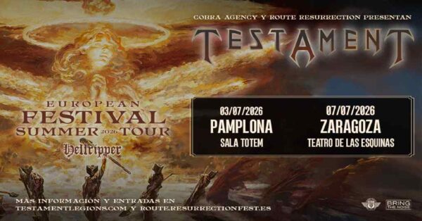 La veterana banda estadounidense de thrash metal Testament ha confirmado su regreso a España este verano con dos conciertos exclusivos dentro de su gira Route Resurrection: Thrash Attack!. En estas fechas, la formación californiana presentará su último álbum Para Bellum y contará con la participación de los británicos Hellripper como banda invitada, aportando su potente sonido black-speed metal a ambos eventos.