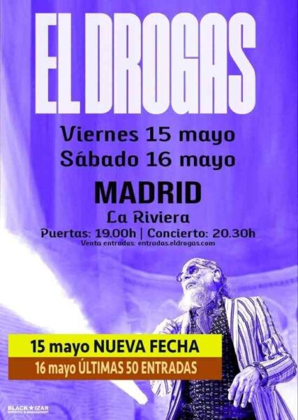 El emblemático artista español El Drogas ha anunciado una nueva fecha de concierto en Madrid para el viernes 15 de mayo de 2026, sumándose a la ya programada actuación del día siguiente. Ambos conciertos tendrán lugar en la Sala La Riviera, ofreciendo una oportunidad ineludible para los seguidores de su música. En estos momentos, quedan las últimas entradas disponibles para la fecha del sábado 16 de mayo, por lo que se recomienda asegurar las localidades cuanto antes dada la alta demanda.