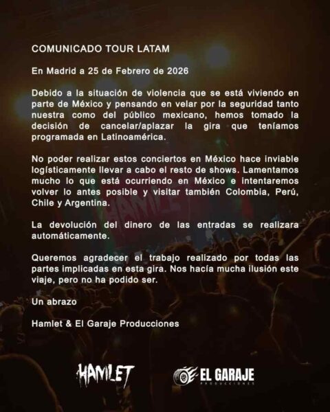 Por ahora, se recomienda a los fans estar atentos a los canales oficiales de Hamlet y a los promotores locales para conocer información sobre devoluciones de entradas o futuras reprogramaciones.